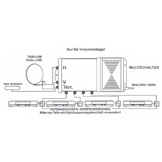 Dieser Multischalter erlaubt Ihnen, alle analoge TV- und Radio- Sat-Programme von einem Satelliten an vier Nutzer/ Receiver zu verteilen. Ferner kann an das Gerät auch eine terrestrische Antenne angeschlossen werden, deren Programme den Nutzern auch zur Verfügung gestellt werden. Das Gerät arbeit nur sinnvoll in Verbindung mit einem ältern Twin-LNC (kein Universal-LNC) und Analog-Receivern zusammen.