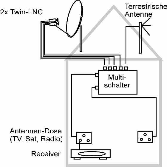 Mit diesem Multischalter ist es möglich, alle analogen und digitalen TV- und Radio-Programme von zwei Satelliten (z.B. Astra und Hotbird) zu empfangen und an bis zu 2 Nutzer/Receiver im Haus zu verteilen. An dieses Gerät kann zusätzlich noch eine terrestrische Antenne direkt angeschlossen werden und ebenfalls den 2 Nutzern zugänglich gemacht werden. Voraussetzung hierfür ist lediglich eine Satelliten Antenne, zwei Twin-Universal-LNCs und eine der Zahl der Nutzer entsprechende Anzahl von digitalen oder analogen Sat-Receivern.