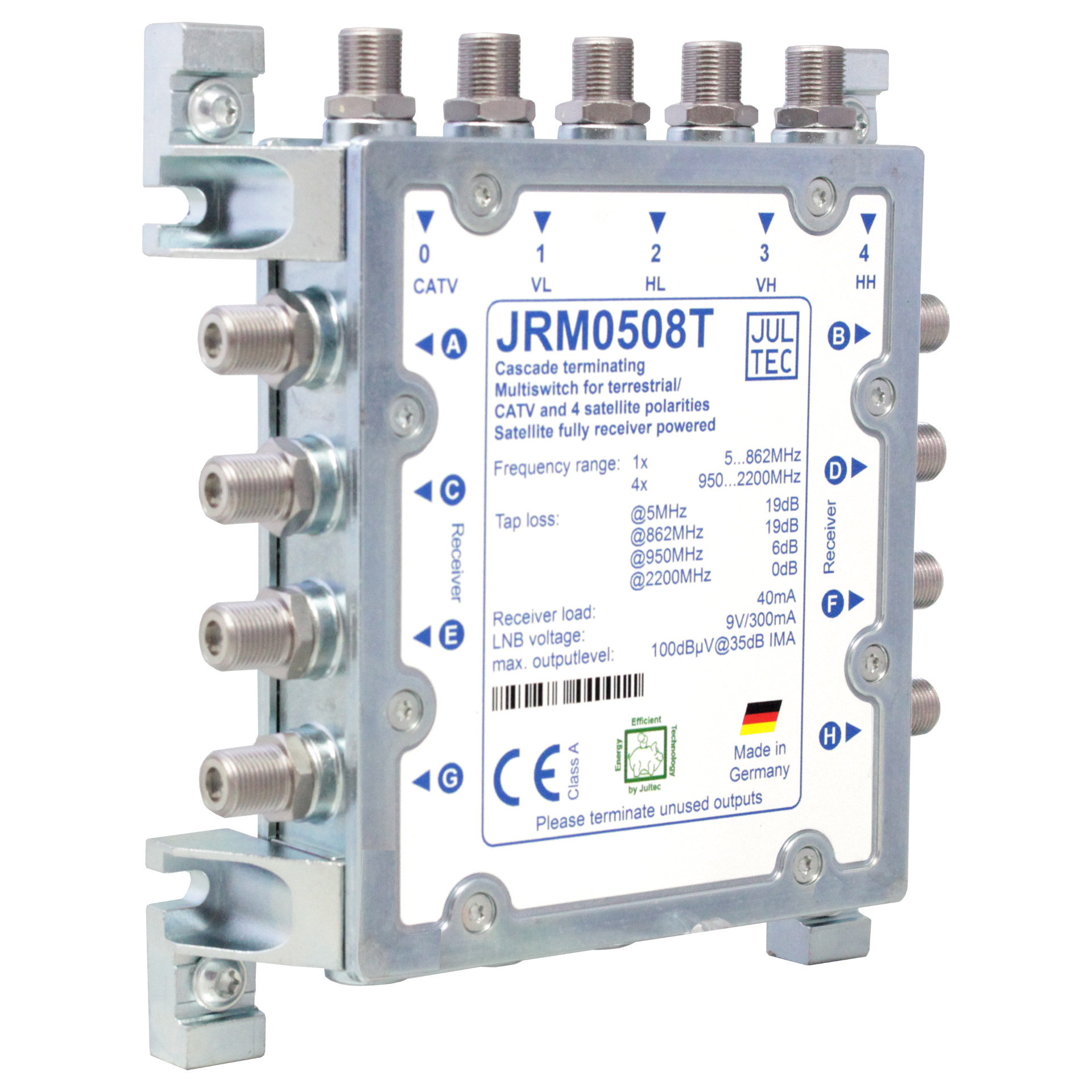 Jultec ist DER deutsche Premiumhersteller von Multischaltern, Einkabelroutern und Zubehör für professionelle Anwender. Der JRM0508 eignet sich hervorragend als Basisgerät einer SAT-Anlage fürs Einfamilienhaus und so wendet sich dieses Angebot insbesondere an Eigenheimbesitzer, die Wert auf kompromißlose Qualität und Langlebigkeit legen. Mit dem Erwerb des JRM0508 profitieren Sie von folgenden Vorteilen: - Höchste Energieeffizienz. Der Schalter besitzt keinen eigenen Stromanschluss sondern wird aus den angeschlossenen Receivern gespeist. Wenn alle Receiver ausgeschaltet sind, bekommt die gesamte Anlage keinerlei Strom. Das spart, je nach Fernsehgewohnheit 15 - 20€ Stromkosten pro Jahr, eventuell sogar noch mehr. - Reduzierte Speisespannung für das LNB. Alle Schalter der JRM-Reihe geben nur so viel Spannung für das LNB aus, wie zum einwandfreien Betrieb erforderlich ist. Auch das vermindert die Stromkosten und erhöht dank geringerer thermischer Belastung die Lebensdauer des LNB und der angeschlossenen Receiver. - Robustes Gehäuse aus Alu-Druckguß. Das Gehäuse schützt wirkungsvoll die eingebaute Elektronik und schirmt hervorragend gegen Störungen aller Art ab. Die Rückseite des Gehäuses dient gleichzeitig Kühlkörper für die Bauteile. - Hochwertige NITIN-beschichtete F-Buchsen mit Mehrfach-Innenleiterkontaktierung. Dank der Beschichtung und der speziellen Kontaktierung bekommen Sie sichere und sehr langlebige Verbindungen. Die Kontakte können auch von Personen mit Nickel-Allergie problemlos angefasst werden. Das typische Einsatzgebiet für diesen Schalter ist die Verteilung der Signale eines Satelliten an bis zu 8 Teilnehmer. Zusätzlich können die Signale einer terrestrischen (UKW oder DVB-T) Antenne eingespeist werden. Auch der Anschluß von Kabelfernsehen zum Betrieb interaktiver Dienste ist möglich. Bei Verwendung von hochwertigen Leitungen für Ihre Anlage sind einzelne Kabelstrecken von bis zu 80m ohne Qualitätsverlust möglich. Bei weniger gutem Stahlkupfer-Kabel (Staku oder CCS) sinkt die Maximallänge beträchtlich, auf ca. 20 - 25 m. Solches Kabel sollte in Verbindung mit dem JRM0508 oder anderen receivergespeisten Schaltern der JRM-Reihe nicht verwendet werden. Den JRM0508 gibt es in drei Versionen: - JRM0508T. Dieser Schalter ist intern terminiert, d.h. die vom LNB (und, falls vorhanden, der terrestrischen Antenne) kommenden Stammleitungen enden in dem Gerät. Der JRM0508T dient als Einzelgerät oder als letztes Gerät in einer Kaskade aus mehreren Schaltern. - JRM0508A. Bei diesem Schalter sind die Stammleitungen wieder herausgeführt. Das Gerät wird dann genutzt, wenn die Stammleitungen noch zum Anschluss weiterer Geräte gebraucht werden. Es ist auch möglich, mittels externer Widerstände den JRM0508A selbst zu terminieren und wie einen JRM0508T zu verwenden, um sich die Option auf Erweiterung für später freizuhalten. - JRM0508M. M steht für Multimedia. Der Schalter verhält sich im SAT-Bereich wie ein JRM0508A, jedoch ist der terrestrische Bereich intern terminiert. Die Zuführung der terrestrischen Signale an mehrere Geräte erfolgt über einen Verteiler. Das sichert für die Terrestrik einen gleichmäßigen Pegel an allen Ausgängen und erleichtert das Einmessen des Rückkanals durch den Techniker des Kabelanbieters. Bitte, geben Sie bei der Bestellung an, welche Version Sie wünschen. Fehlt die Angabe, liefern wir den JRM0508T, er ist in 90% aller Anwendungsfälle genau richtig.