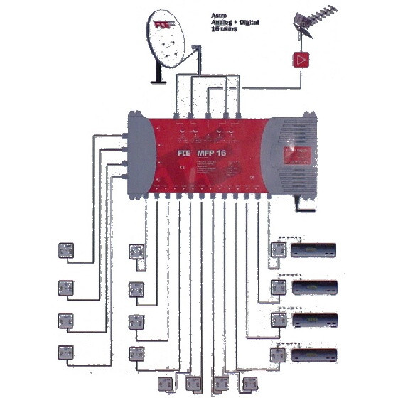 Mit diesem Multischalter ist es möglich, alle analogen und digitalen TV- und Radio-Programme von einem Satelliten (z.B. Astra 19,2° Ost) zu empfangen und an bis zu 16 Nutzer im Haus zu verteilen. An dieses Gerät kann zusätzlich noch eine terrestrische Antenne direkt angeschlossen werden und ebenfalls den 16 Nutzern zugänglich gemacht werden. Voraussetzung hierfür ist lediglich eine Satelliten Antenne, ein Quattro-Universal-LNC und eine der Zahl der Nutzer entsprechende Anzahl von digitalen oder analogen Sat-Receivern.