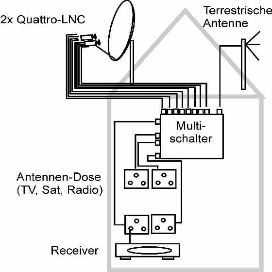 Mit diesem Multischalter ist es möglich, alle analogen und digitalen TV- und Radio-Programme von zwei Satelliten (z.B. Astra 19,2 ° Ost und EutelSat 13° Ost Hotbird) zu empfangen und an bis zu 4 Nutzer/Receiver im Haus zu verteilen. An dieses Gerät kann zusätzlich noch eine terrestrische Antenne angeschlossen werden und ebenfalls den 4 Nutzern zugänglich gemacht werden. Dieser Mutlischalter erlaubt ferner die Eingangsstärke der Signale einzeln zu steuern. Voraussetzung hierfür ist lediglich eine Satelliten Antenne, zwei Quattro-Universal-LNCs und eine der Zahl der Nutzer entsprechende Anzahl von digitalen oder analogen Sat-Receivern.