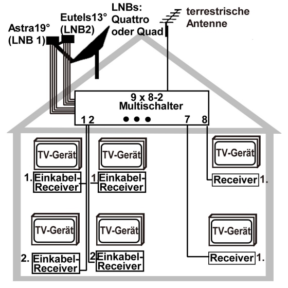;;Die Ersparnis kann meist dann realisiert werden, wenn man vorher einen KabelTV-Anschluss hatte, und nun auf Satellitenempfang umstellen möchte. Es ist dann mit diesem Multischalter möglich, das vorhandene Kabel weiter zu verwenden, es brauchen keine neuen Kabel verlegt werden. Jeder der Ausgänge kann sowohl im Einkabel/Unicable/EN50494 Modus als auch im normalen Receivermodus betrieben werden. An dem vorhandenen Kabel, der sog. Stammleitung(en) können dann bei diesem Multischalter bis zu zwei Unicable-taugliche Satellitenreceiver betrieben werden. Dieser Multischalter hat acht Ausgänge, diese können entweder im Einkabel-Modus oder im Normalmodus (zum Betrieb von analogen, digitalen, HDTV oder auch Twinreceivern) genutzt werden.