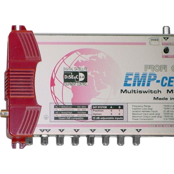 Möchte man alle TV- und Radioprogramme von zwei verschiedenen Satellitenpositionen wie z.B. Astra 19,2 Grad und Eutelsat 13 Grad an bis zu sechzehn Satellitenreceiver verteilen, so könnte man auf diesen EMP MS9/16PIU-6 Multischalter zurückgreifen. Dabei ist dieser Multischalter uneingeschränkt sowohl geeignet für die normalen digitalen TV-Programme als auch für die HDTV-Programme. Jeder Twin-Receiver, der an dem Multischalter betrieben wird benötigt zwei Leitung - für jeden Tuner eine. An dem EMP MS9/16PIU-6 können sowohl Quad als auch Quattro-LNBs betrieben werden, das heißt wenn Sie bisher in Ihrer Satellitenanlage ein LNB mit integriertem Multischalter nutzen (Quad-LNB) braucht dieses nicht ausgetauscht werden. Es kann weiterhin genutzt werden. Die Signalstärke kann für jeden Eingang individuell über Drehschalter festgelegt werden, so dass unterschiedliche Signalstärken Rechnung getragen werden kann. Dieser Multischalter erlaubt es auch die terrestrischen Signale einer Antenne den Receivern zur Verfügung zu stellen. Der EMP MS9/16PIU-6 hat darüber hinaus auch noch einen Anschluss zur Erdung.