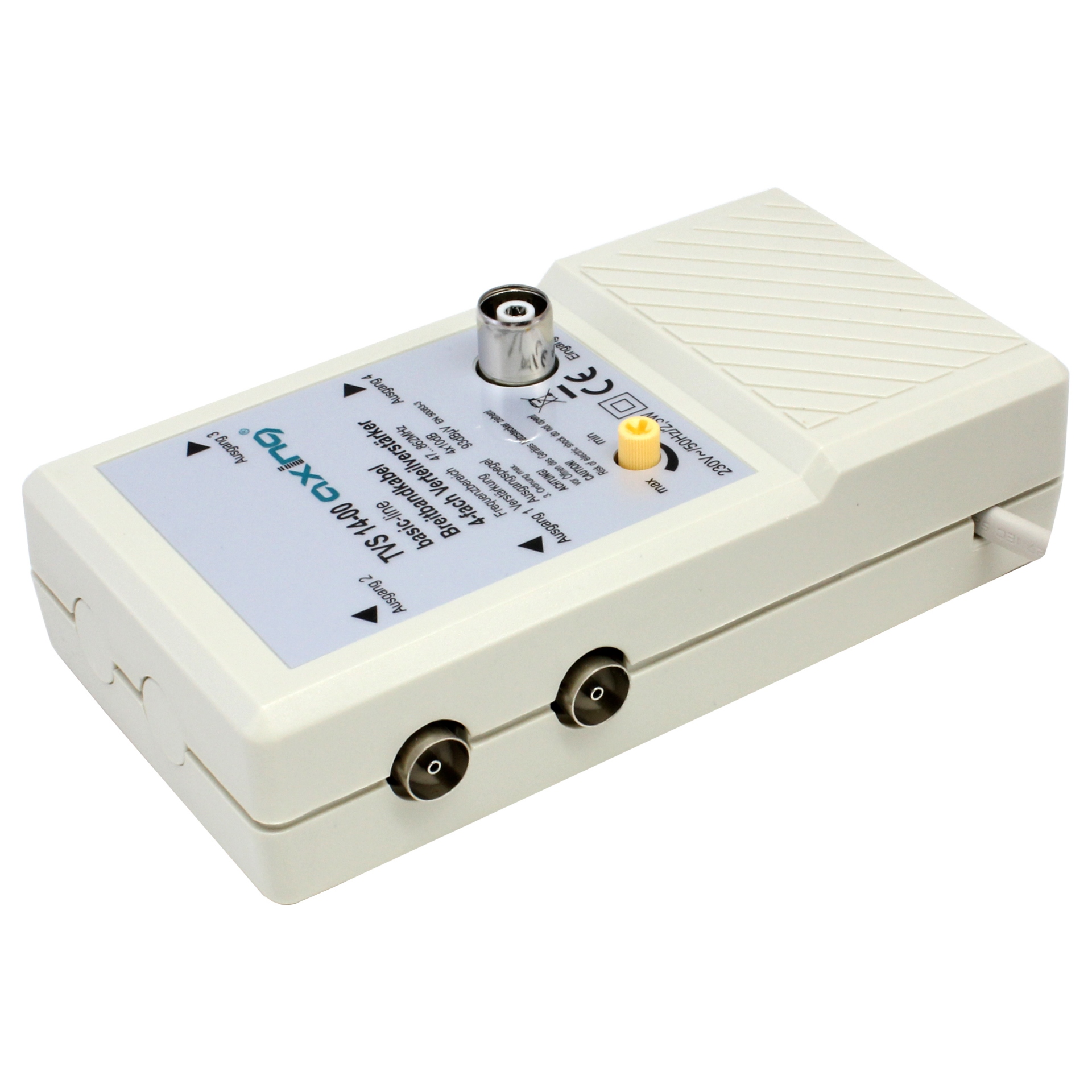 DVB-T2 Vierfach Verstärker für bis zu vier Receiver. Der Axing TVS 14-00 kann sinnvoll eingesetzt werden, wenn man terrestrisches Fernsehen empfangen möchte und dabei längere Kabelwege überbrücken muss. Die Verstärkung beträgt 4x 10dB. Mittels Drehreglers kann das optimale Niveau angepasst werden.