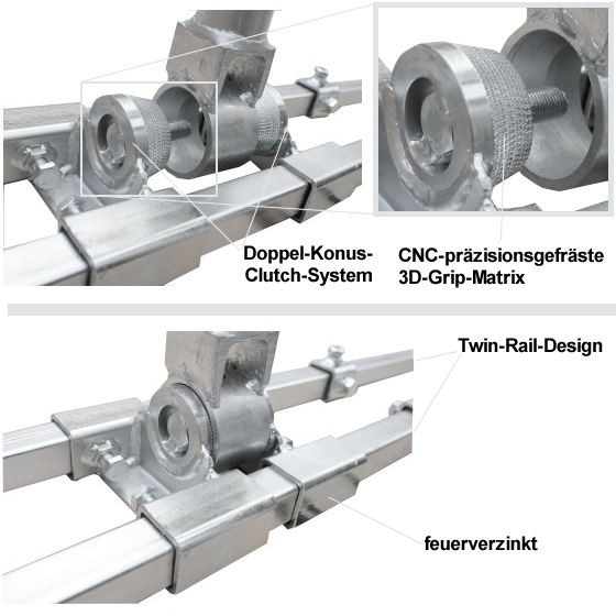Man erkennt auf den ersten Blick, dass der Stormsafe N1000 wie andere sehr gute Dachsparrenhalter alle relevanten Qualitätsmerkmale erfüllt. Die signifikanten Unterschiede hinsichtlich Sicherheit, Zuverlässigkeit und einer ausgereiften Konzeption, durch die sich der Stormsafe N1000 noch zusätzlich von ähnlichen Produkten abheben kann, eröffnen sich erst bei der genaueren Betrachtung. Das Doppel-Konus-Clutch-System mit einer CNC-präzisionsgefrästen 3D-Grip-Matrix erlaubt einerseits eine schnelle sowie exakte Installation und Ausrichtung, andererseits einen extrem festen Halt. Denn die mit ca. 2000 Zähnen versehene Oberfläche vergrößert den Anpressbereich gegenüber Standardhaltern um 100%-400% und widersteht einer Windlast von bis zu 1000Nm! Hochwertige Materialen wie feuerverzinkter Stahl und eine sehr sorgfältige Verabeitung trotzen widrigsten Umweltbedingungen und sorgen zudem für höchste Zuverlässigkeit und Langlebigkeit. Das Twin-Rail-System als Basis des Masts verleiht dem Mast Stabilität auf den Dachsparren. Der bereits vormontierte Halter ist in wenigen Handgriffen montiert und an die Gegebenheiten des Dachs angepasst. Die Universalität des Stormsafe N1000 sucht seinesgleichen: Sie erlaubt eine laterale Grobanpassung an einen Dachsparrenabstand von 55-90cm und eine Feinjustierung zur Berücksichtigung individueller Dachpfannengrößen. Ferner kann eine Dachneigung von 20-160Grad berücksichtigt werden. Darüber hinaus ist der Mast mit 130cm so dimensioiniert, dass er unterschiedlichsten Sat-Antennen-Systemen genügend Platz bietet, so dass sogar Raum für zwei Antennen ist. Der Mastdurchmesser beträgt 48mm. Ein weiteres Plus dieses Dachmontagesystems ist, die Möglichkeit der Umsetzung einer sehr sauberen und professionellen Gestaltung der Kabelführung. Die Koaxialkabel, die vom LNB in das Haus gelegt werden sollen, können von oben unsichtbar im Innern des Mastes direkt unter die Dachziegel geführt werden. Dazu ist eine optional erhältliche Mastkappe mit Kabeldurchführung für 32-60mm verfügbar, die den Mast für eine solche Anwendungssituation sicher gegen Regenwassereintritt verschließt. Der Stormsafe N1000 ist konzipiert für eine wärmebrückenfreie Installtion auf den Dachsparren.