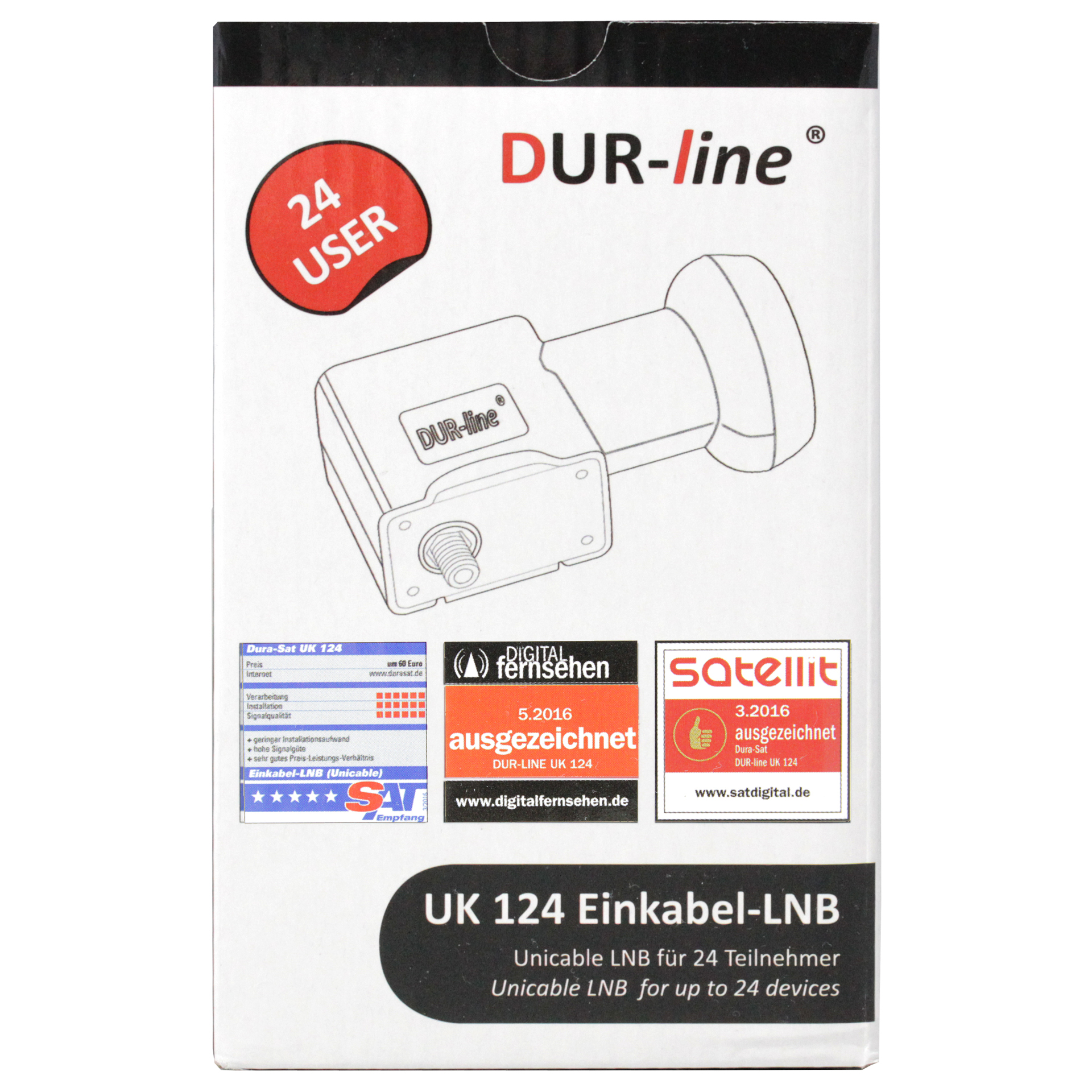 Das Durasat Durline UK124 ist ein Einkabelsystem Unicable LNB. An diesem LNB können alle Satellitensender eines Satelliten über nur ein Koaxialkabel an bis zu 24 Teilnehmer / Receiver / Fernseher verteilt werden. Voraussetzung: Receiver bzw. TVs müssen Unicable unterstützen (üblicher Standard bei allen aktuellen Geräten)