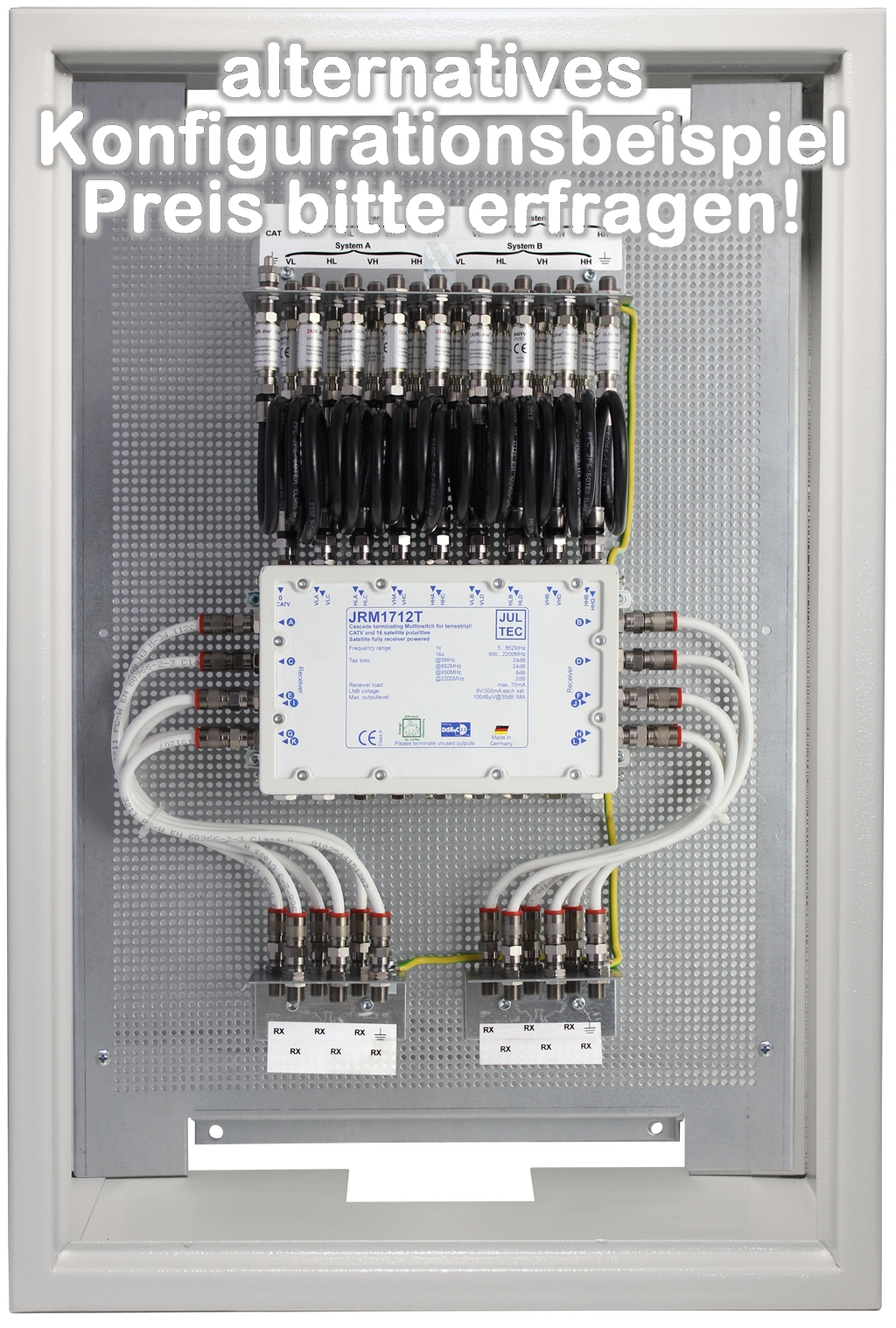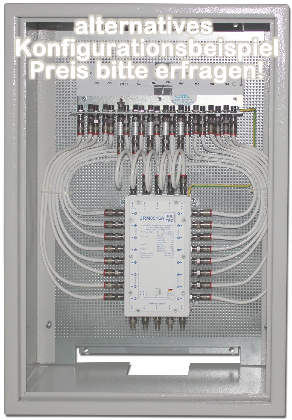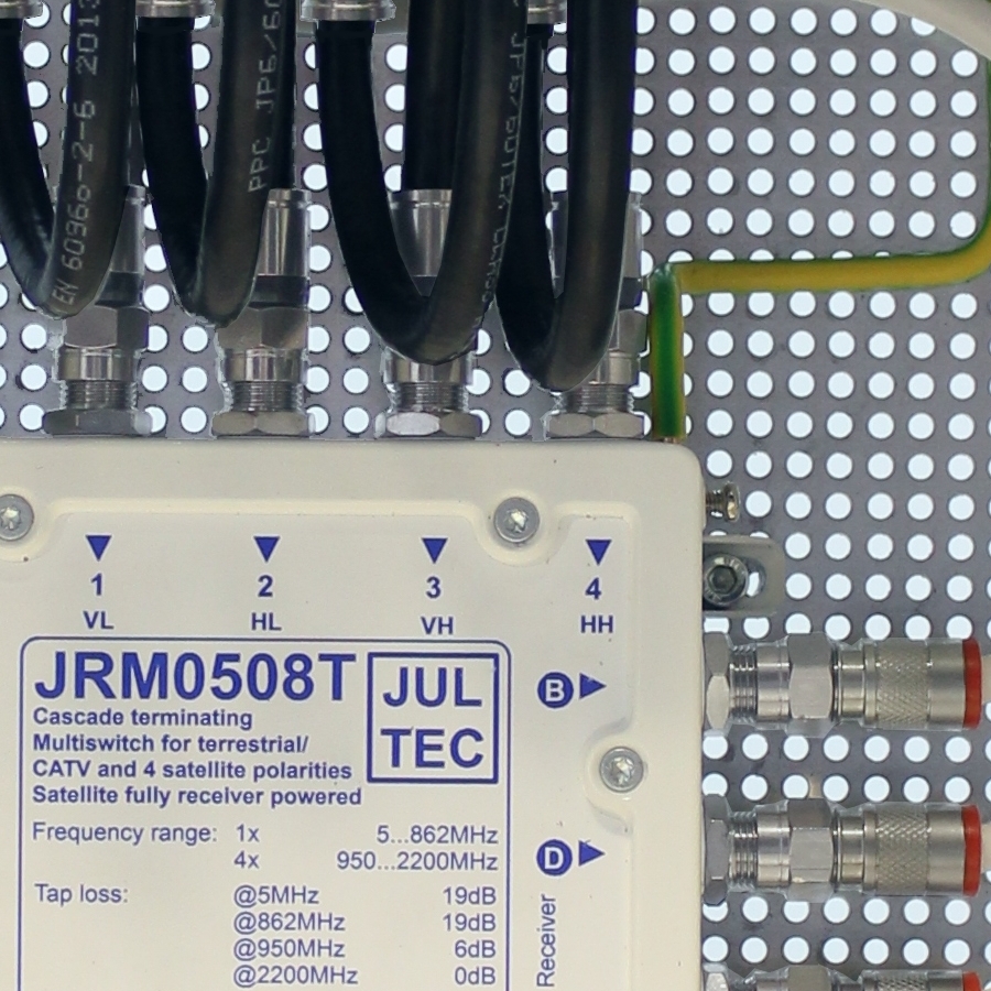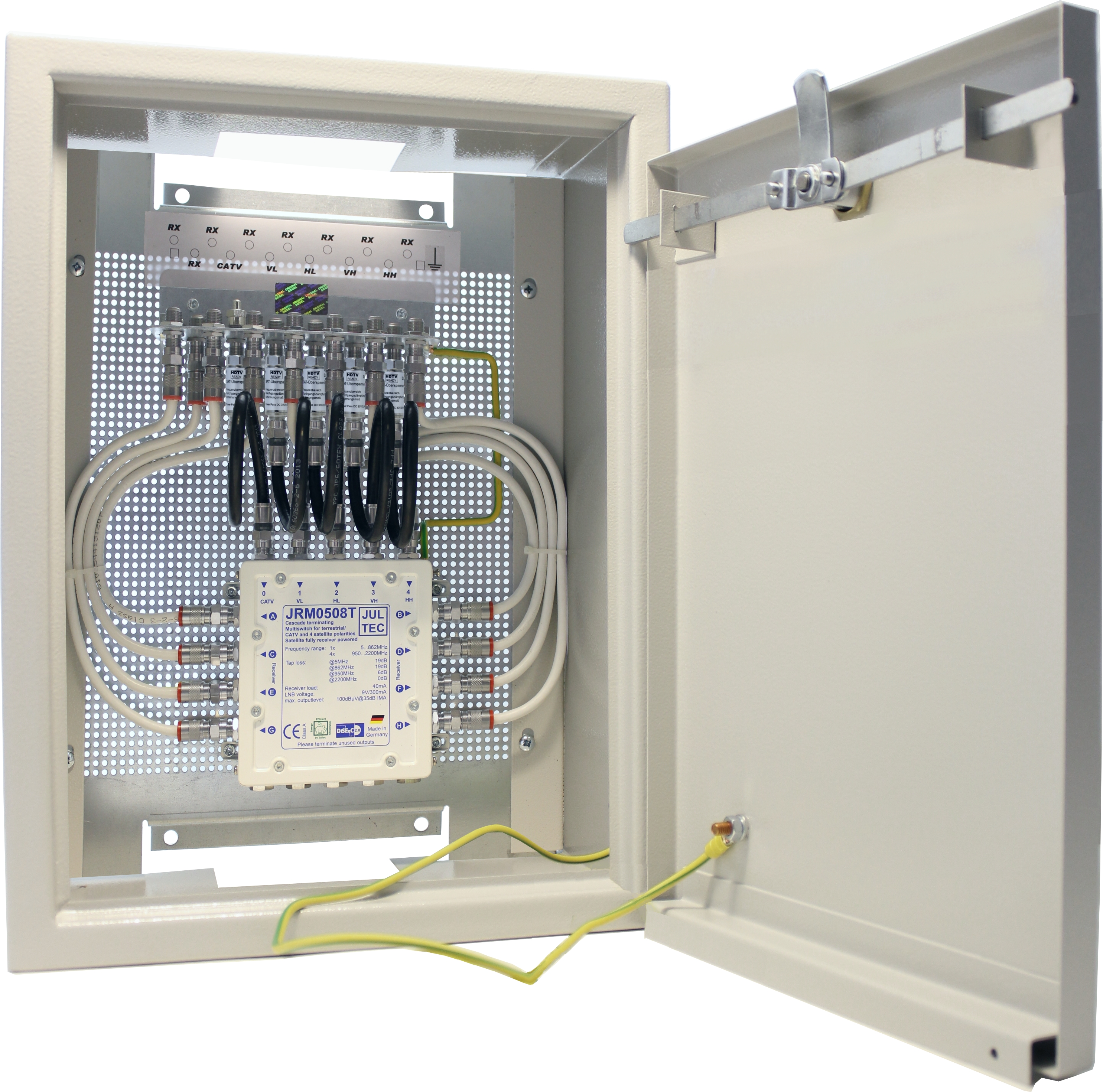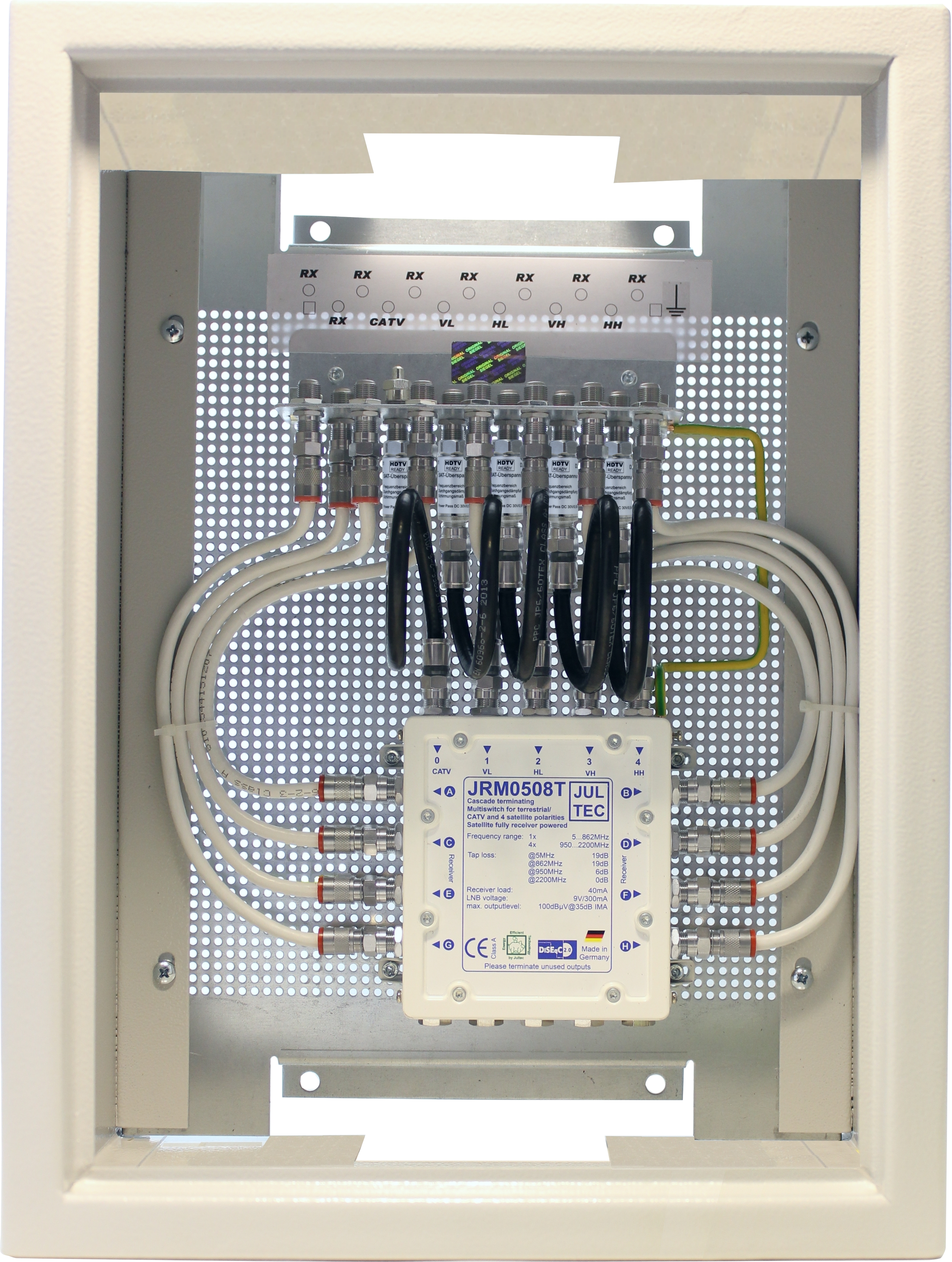 Der Ein-Familien-Haus-Switch-Safe ist die unverzichtbare Lösung, um den Anforderungen an eine normensichere Installation von TV-Broadband-Verteilungssystemkomponenten Rechnung tragen zu können. Bei dem Aufbau einer Satellitenempfangsanlage wird als Installationsort für die Verteilbausteine meist das Dach oder der Keller gewählt. Um diese empfindlichen Komponenten hier sicher zu schützen und dauerhaft einen zuverlässigen Empfang an allen TV-Geräten zu gewährleisten, ist es sinnvoll, eine Lösung zu wählen, die vor unbeabsichtigten mechanischen kurzschluss-auslösenden oder elektromagnetischen Einflüssen und ungewünschten Zugriff (z.B. durch kleine Kinder) schützt Der EFH-Switch Safe ist vorkonfiguriert und wird schlüsselfertig geliefert. Bei der Auswahl der Komponenten wurde strikt auf die Verwendung von hochwertigen Bauteilen geachtet. Eine professionelle Verarbeitung war maßgebend. Der EFH-Switch-Safe hat großzügigen Abmessungen von 40x30x20cm. Er besteht aus sehr robustem 1,2mm pulverbeschichtetem Stahlblech. Die Tür des Switch-Safe ist dreifach verriegelt und mit einem Schloss gesichert. Zwei Schlüssel gehören zum Lieferumfang. So bleibt die Integrietät der Schaltung zu jeder Zeit unberührt. In der hier angebotenen vorkonfigurierten Version gehört zur Ausstattung ein hochkarätiger Jultec JRM 0508T Multischalter, 5x Überspannungsschutzbausteine auf der Eingangsseite, Potentialausgleich aller Bauteile einschließlich des Gehäuses mittels Erdungswinkel und die entsprechende interne Verkabelung mit Hirschmann Kompressionssteckern und Koaxialkabel. Der EFH-Switch-Safe ist für die Wandmontage konzipiert und braucht nach Lieferung nur noch mit den LNB-Leitungen von der Satellitenantenne auf der einen Seite, dem Potentailausgelich und den Receiverzuführungen auf der anderen Seite verbunden werden.