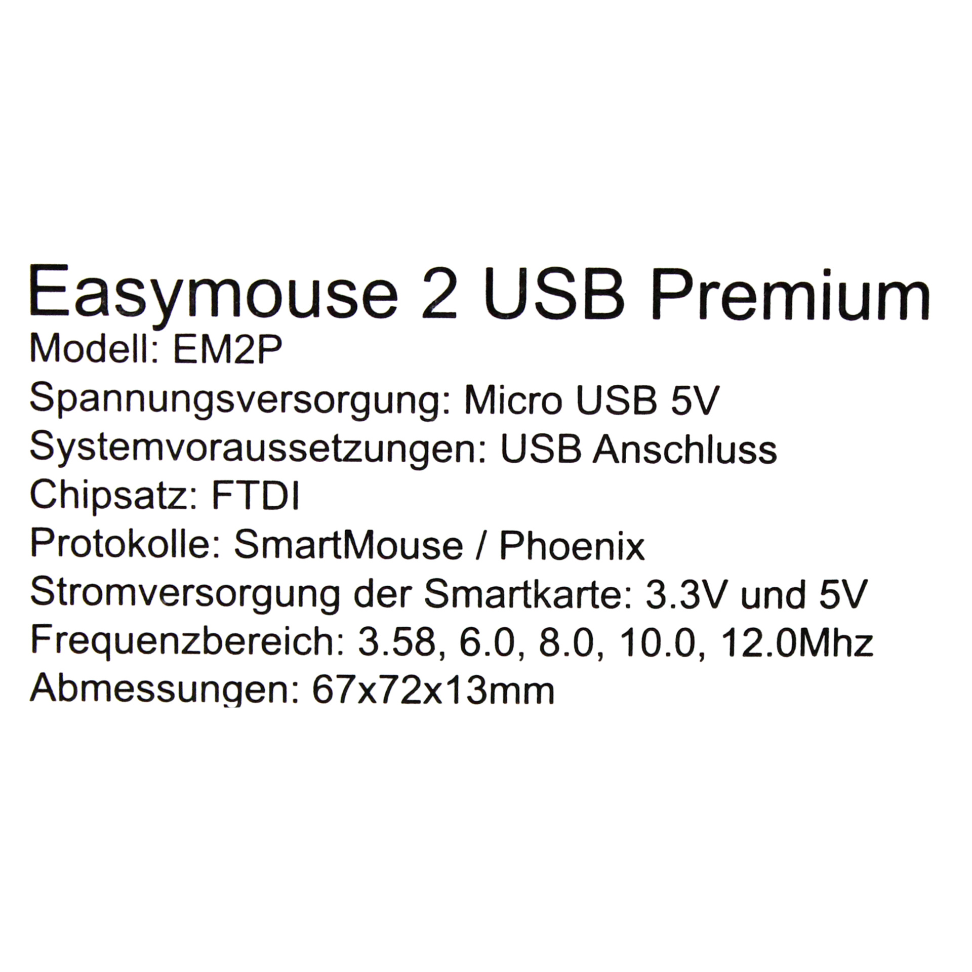 Die Easymouse2 ist ein Lesegerät für Smartkarten. Es wird am USB Anschluss des Computers betrieben. Das Gerät mit dem FTDI Chipsatz unterstützt die Programmierung in verschiedenen Modi, Frenquenzen und Spannungen.