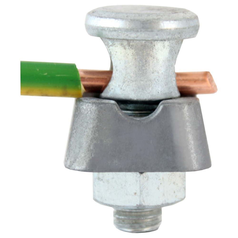 Zum sicheren Befestigen von bis zu vier Sechzehn-Quadrat-Erdungsleitungen. Diese M10 Schraube wird üblicherweise an Erdungsfahnen des Fundamenterders oder zum Beispiel der Dachsparrenhalterung befestigt.