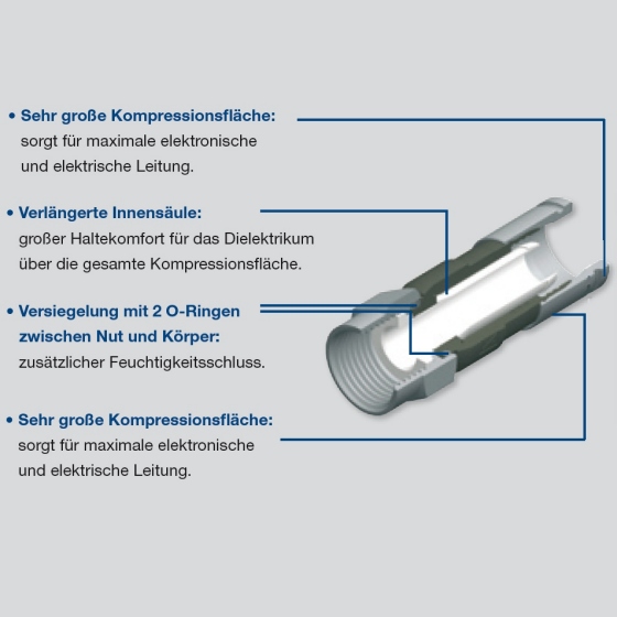 In diesem Kompressions-F-Stecker wurde die Steck-KlemmVerbindungstechnik umgesetzt, die sehr viel bessere Übertragungsqualität garantiert als herkömmliche F-Stecker. Der Vorteil liegt vor allem in der Möglichkeit wetterfeste Verbindungen zwischen Koaxialkabel und Stecker mittels einer hermetischen Verschlusstechnik herzustellen. Weitere Vorzüge sind neben der sehr hohen Zugfestigtkeit, die ein Sich-lösen des F-Steckers vom Kabel verhindert, die hohe Abschirmung und die einfache Installation mit Hilfe einer Kompressionzange. Dieser Stecker eignet sich für das 6.8-7.0mm Koaxialkabel (z.B. Koka 110 HD, Koka 125HD, Koka 99 HD, Koka 110+ HD). Als Kompressionszange ist die FWQ2L passend.