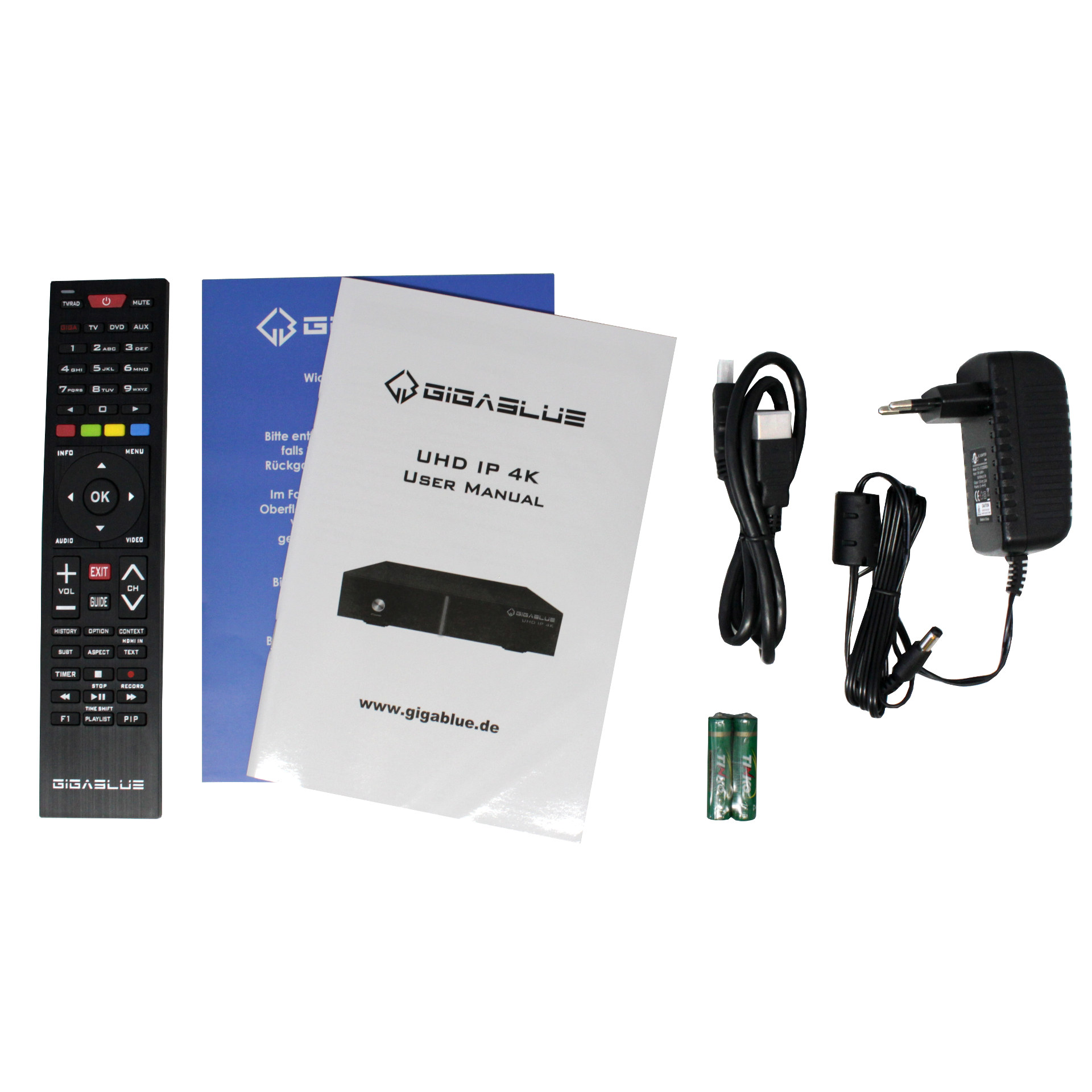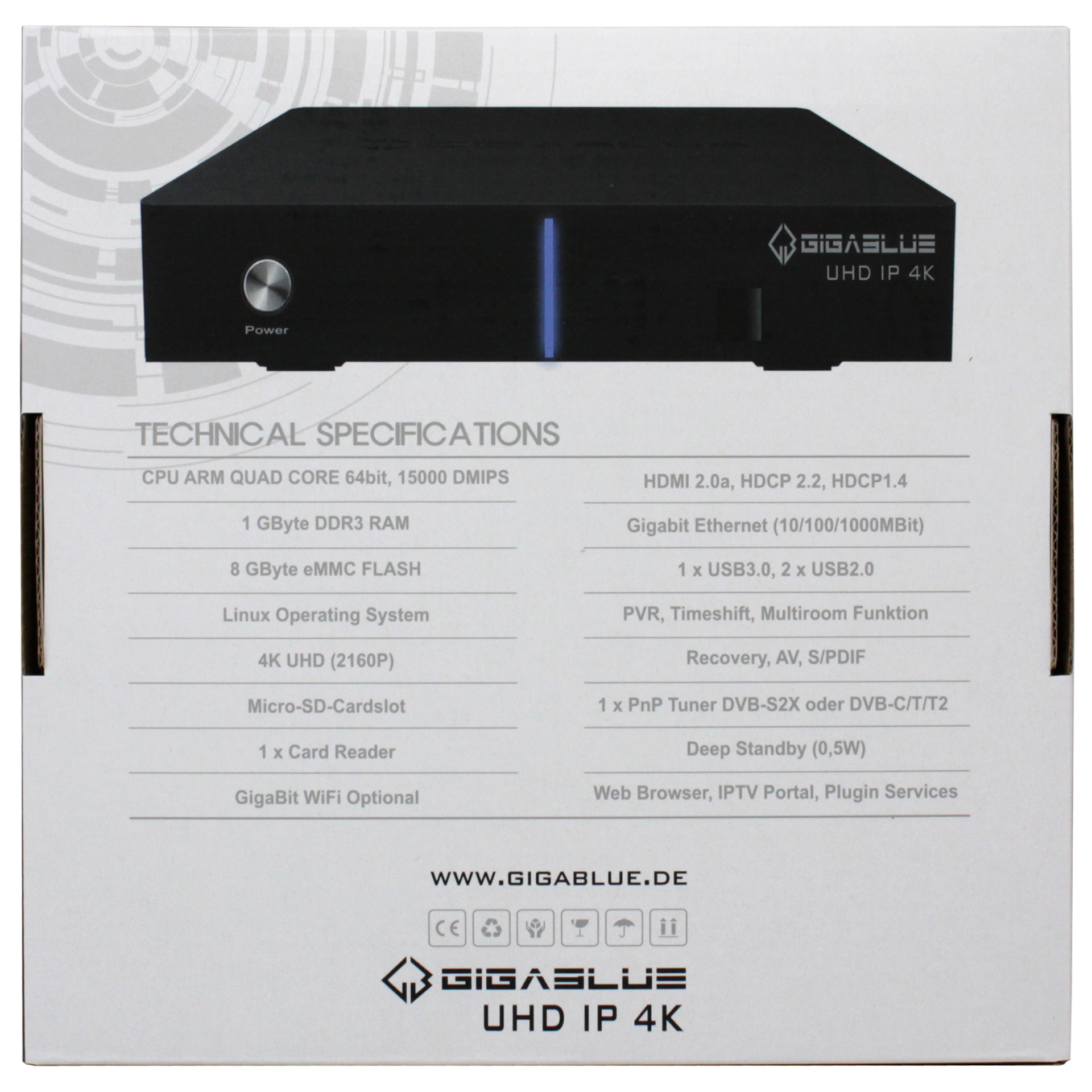 Der Gigablue IP 4k IP Receiver ist ein IP-Streaming-Gerät. Er zeigt Ihnen alle Ihre Lieblingssendungen in HDTV und sogar UltraHD Qualität an. Der schnelle 150000Mips Prozessor garantiert schnelle Programmwechsel. Mit angeschlossener Festplatte bzw. USB Stick können TV-Programme aufgezeichnet werden und zum späteren Zeitpunkt wieder angeschaut werden (zwei USB2.0 Anschlüsse sind vorhanden). Dabei ist die integrierte immer aktuelle elektronische Programmzeitschrift eine super Anwendung - übersichtlich, umfassend informativ und einfach zu bedienen. Mit der Timeshift-Funktion ist es möglich eine laufende TV-Sendung anzuhalten und z.B. nach einer Unterbrechung weiterzusehen. Der Gigablue IP 4k Receiver kann per Handy (d.h. auch von unterwegs) gesteuert werden, d.h. für den Programmwechsel oder das Programmieren von Aufnahmen brauchen Sie nicht zur Gerätefernbedienung zu greifen. Die Nutzung von Internet und Heimnetzwerk ist dank Ethernetanschluss kein Problem. Wenn gewünscht, streamt der Gigablue IP 4k die aktuelle Sendung in Ihrem Netzwerk auf Ihr Handy oder Tablet. Für diesen Receiver ist optional ein DVB-S2X Multistream Single oder Twin Tuner sowie ein Kabelfernsehen-Tuner verfügbar, dieser ist im Lieferumfang nicht enthalten.