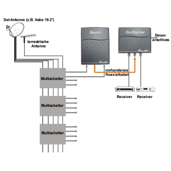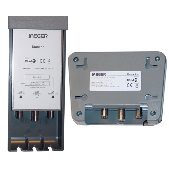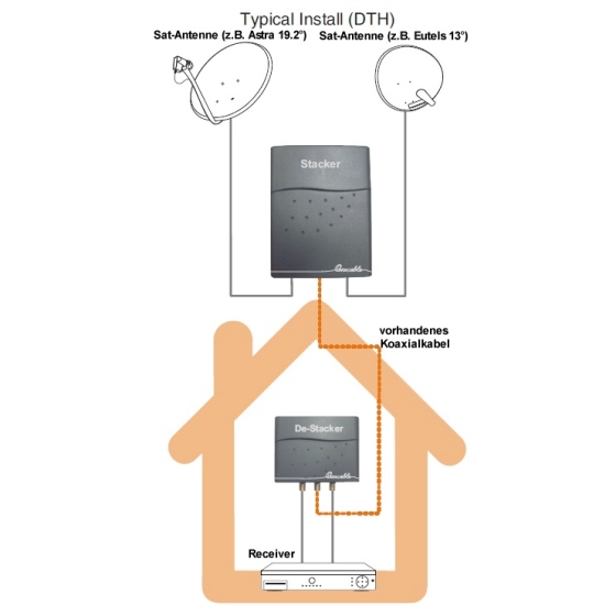 Mit diesem Stacker - DeStacker ist es möglich, einen Twin-SatellitenReceiver mit nur einem Koaxialkabel zu betreiben. Ein typischer Anwendungsfalls ist der Folgende: Man hat bei der Installation seiner Satellitenanlage nur ein Koaxialkabel von der Antenne zum Satellitenreceiver gelegt. Nun möchte man aber den alten Receiver ersetzen durch einen Twin-Receiver. Das bedeutet normalerweise entweder ein zweites Kabel zu verlegen und ggfs auch das LNB zu tauschen oder den Twin-Receiver nur mit starken Einschränkungen zu nutzen. Mit diesem Stacker-Destacker können Sie nun, ohne weitere Veränderungen den Twin-Receiver uneingeschränkt nutzen ohne LNB-Tausch und ein neues Koaxialkabel. Diese Technologie kann bei dem Empfang von einem Satelliten z.B. Astra 19Grad oder auch bei dem Empfang von zwei Satelliten Astra 19 Grad und EutelSat 13Grad verwendet werden. Der Stacker-DeStacker ist nutzbar für digitales TV und Radio als auch uneingeschränkt für HDTV-Empfang. Voraussetzungen: Koaxialkabel mit mindestens 100dB Rauschmaß und nicht mehr als 60m zwischen LNB und Receiver. Stacker und Destacker müssen direkt mit einander verbunden sein.