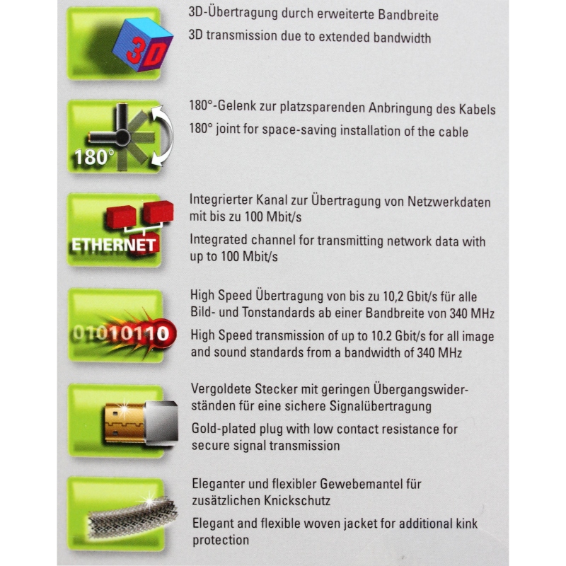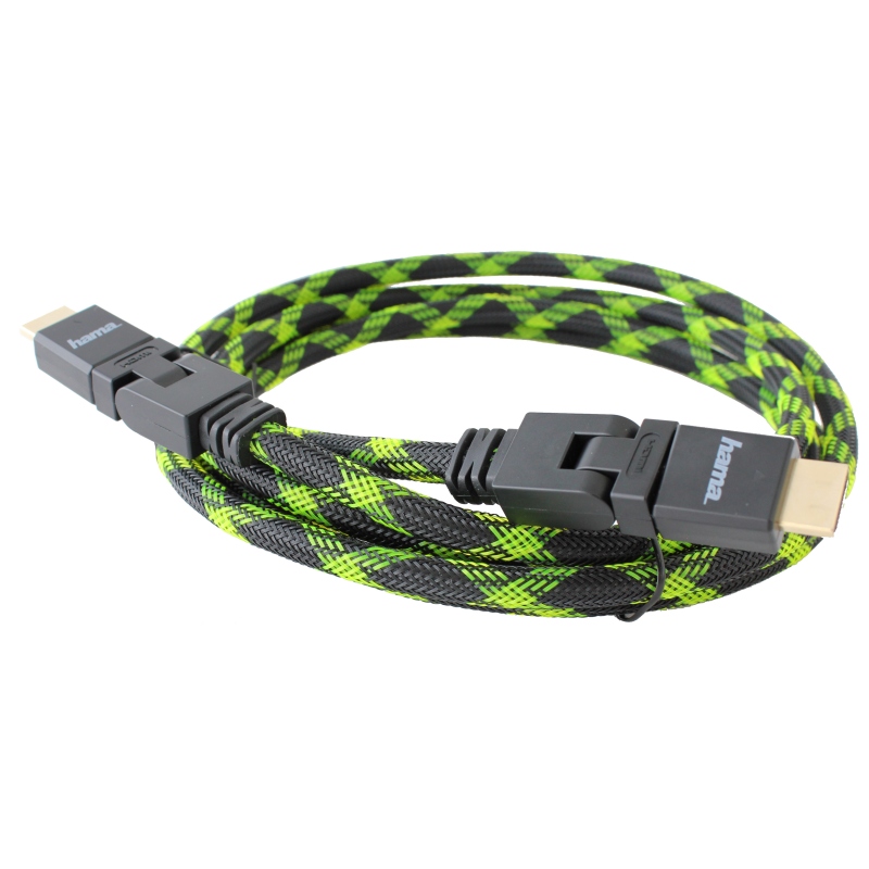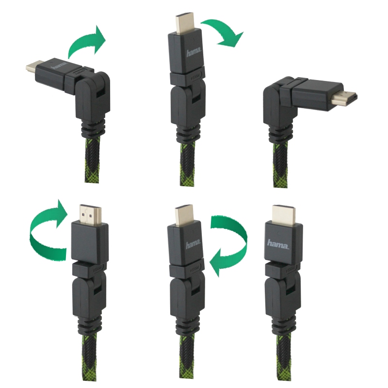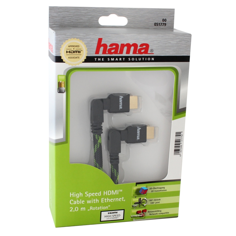 2m HDMI Kabel von Hama. Geeignet für digitales TV, PayTV, 4K, Bluray, 3d. Mit zwei Steckergelenken und doppelter Drehbarkeit, so dass auch Anschluss des FlachTVs gelingt, wenn wenig Platz ist. Mit Gewebeband.