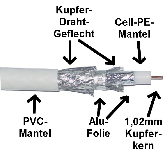 Dieses Premium Koaxialkabel eignet sich für DVB-T, DVB-S, DVB-S2 und HDTV, da es durch seine hervorragenden physikalischen Eigenschaften besticht: einem starken 1,02mm massiven Kupferkern, mit nur 16dB Durchgangsdämpfung. Dieser sorgt für eine hohe freie Bandbreite, d.h. sehr viele Informationen können gleichzeitig durch das Kabel transportiert werden: wie z.B. bei digitalem hochauflösenden Fernsehen HDTV, Internet-Telephonie und Internet-Daten. Damit während der Übertragung Bild, Ton, Daten und Steuersignale nicht beeinträchtigt werden, ist dieses Premium Koaxialkabel vierfach abgeschirmt: der 4,8mm Cell PE-Schaum, wird von einer vollständig umschließenden Aluminiumfolie eingefasst. Dieser folgt ein Geflechtdraht aus verzinktem Kupfer mit hoher Geflechtdichte sowie eine weitere Aluminiumfolie mit einem weiteren Geflechtdraht von hoher Dichte. Diese vierfache Alu-Kupfer-Abschirmung schirmt das Kabel mit 110dB ab. Störstrahlung wie sie z.B. von Funktelefonen, Mobiltelefonen, Wireless-Computer-Komponenten ausgehen, können keinen Schaden mehr anrichten. Dieses Kabel sollte auf jeden Fall Anwendung finden, wenn das Kabel in dem mittelbaren Umfeld mehrerer Störquellen verlegt werden soll, in Fällen in denen weite Kabelstrecken zu überwinden sind (>18m) und wenn das Kabel digitales, hochauflösendes TV übertragen soll. Mögliche Symptome bei unzureichend abgeschirmten Kabel, wie z.B. Zusammenbruch des TV-Bilds bei Benutzung des Funktelefons oder nicht richtig arbeitende Multischalter sind mit diesem Kabel ausgeschlossen. Zur einfacheren Verlegung ist das Kabel mit einer Metermarkierung versehen. Alle 7.0mm F-Stecker können mit diesem Kabel genutzt werden..