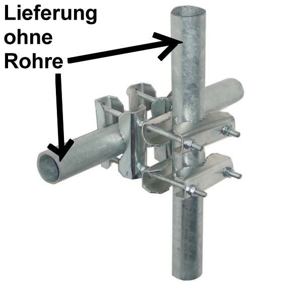 Dieser Verbindungshalter erlaubt es, zwei bis zu 60mm starke Rohre an einander zu befestigen. Der Halter kann auch zum Befestigen eines Mastes an einem waagerecht verlaufenden Rohrs verwendet werden. Der Adapter besteht aus verzinktem Stahl. Die Auf den Bildern dargestellten Rohre dienen der Illustration alternativer Anwendungsmöglichkeiten und gehören NICHT zum Lieferumfang.