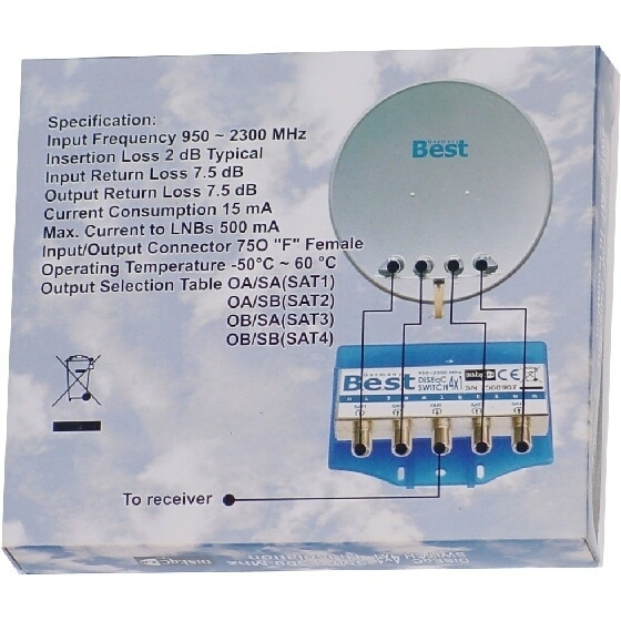 Möchten Sie bis zu vier LNBs an einem Sat-Receiver betreiben, so können Sie dazu dieses DiSEqC-Relais von Best benutzen. Dieses Relais hat vier LNB-Koaxial-Eingänge und einen Koxial-Ausgang um einen Receiver anzuschließen.