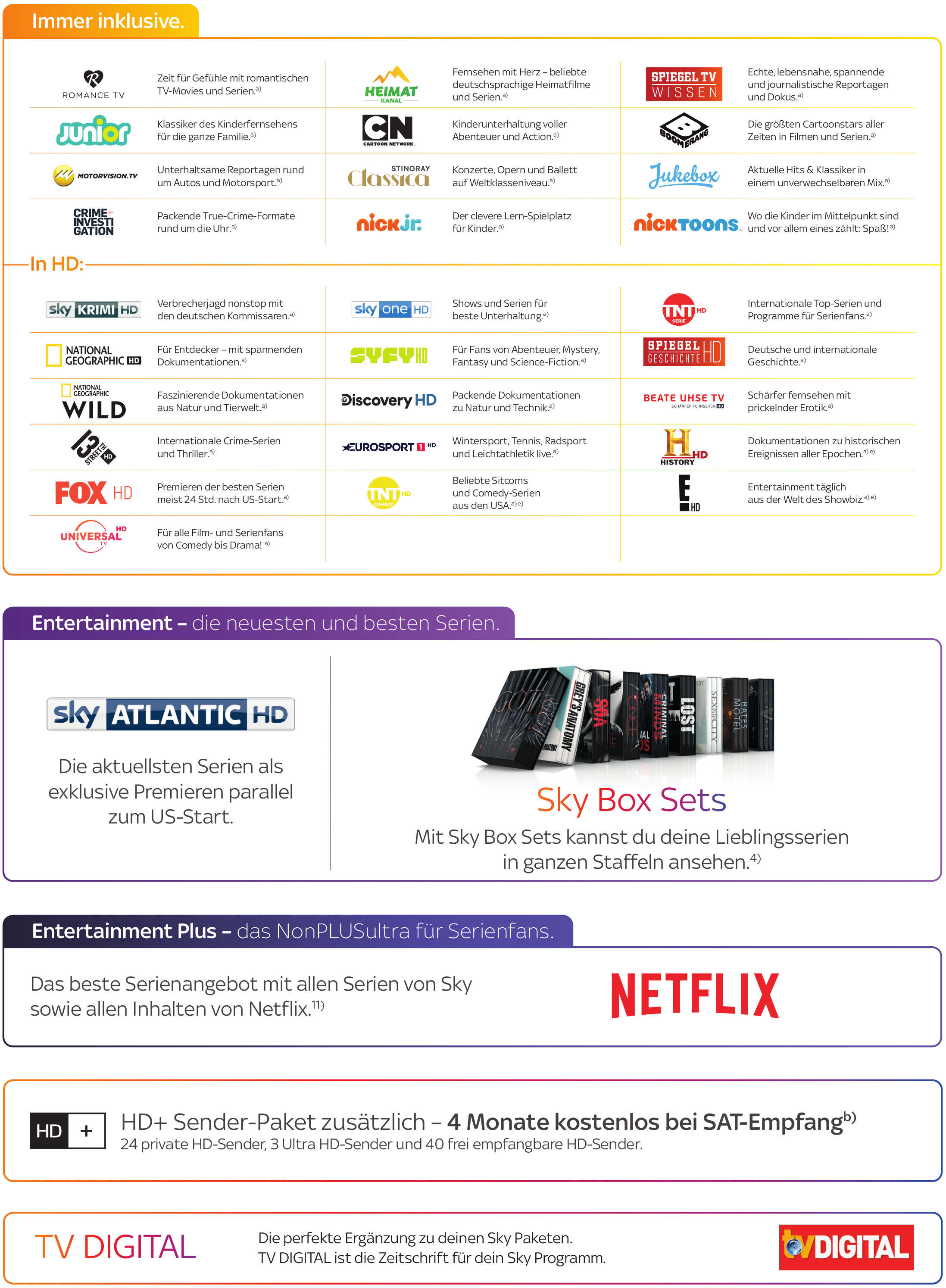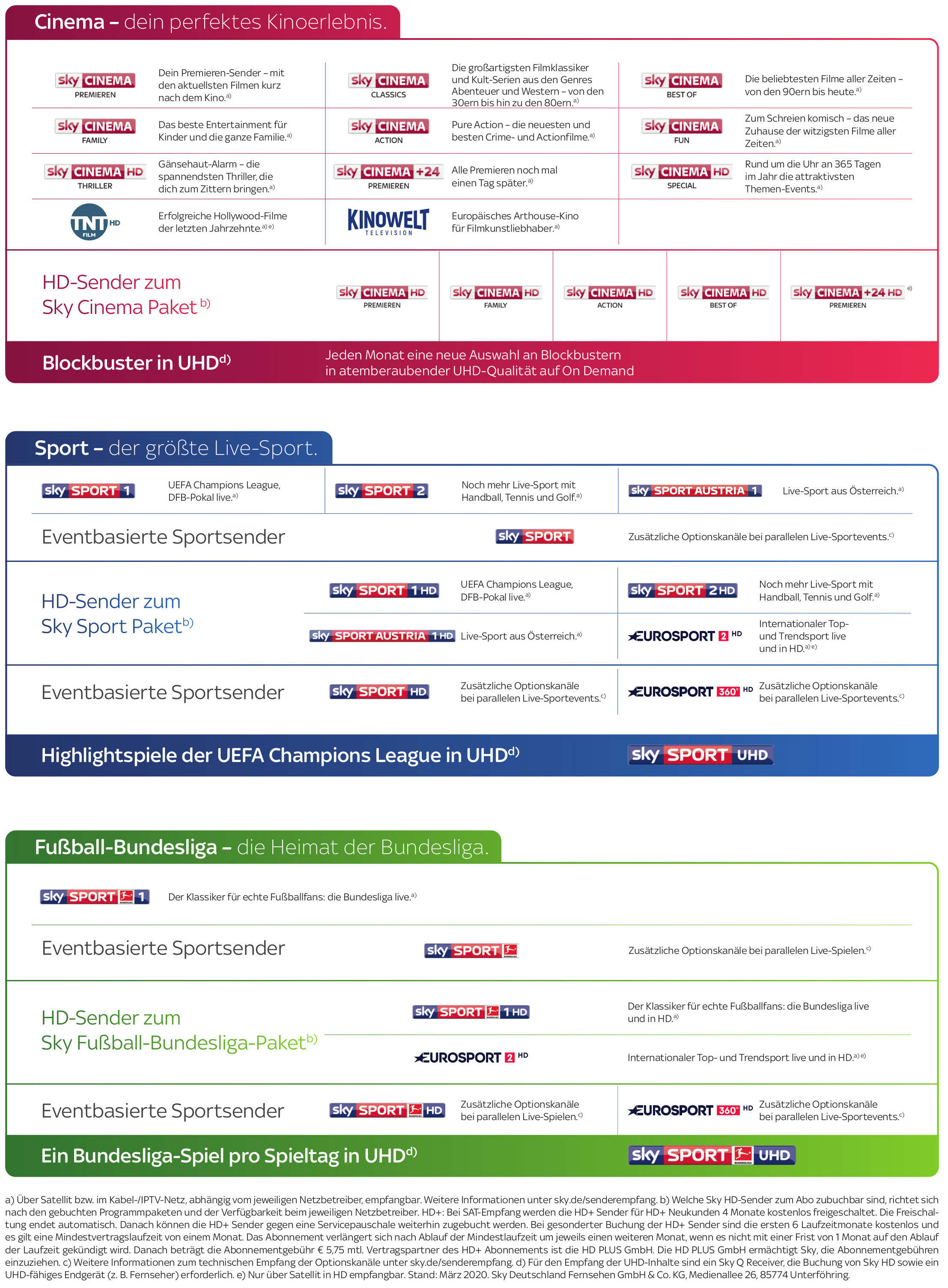 ;; Allgemein : Die kostenpflichtige Erstlaufzeit beginnt mit Zugang der Zugangsdaten zur Nutzungsmöglichkeit von Sky Go und umfasst den Monat der Abonnement-Aufnahme (anteilig) zuzüglich 23 Monate (24-Monats-Abo). Sky stellt die Zugangsdaten regelmäßig unmittelbar nach Vertragsschluss zur Verfügung, spätestens jedoch mit Zugang von Smartcard und Receivers (Hardware) zur Nutzung des linearen TV-Programms. Die Hardware wird dem Kunden innerhalb von längstens 15 Tagen nach Zugang der Zugangsdaten für Sky Go zur Verfügung gestellt. Verlängerung : Bei nicht fristgerechter Kündigung (2 Monate vor Ablauf der Vertragslaufzeit) verlängert sich das Abonnement automatisch um weitere 12 Monate zu den Standardpreisen. HD / UHD: Zu den gebuchten Premium Paketen können wahlweise die aktuell empfangbaren Sky Premium-HD-Sender für die ersten 12 Monate für € 5 mtl. (danach € 10 mtl.) mit einer Mindestvertragslaufzeit von 24 Monaten hinzugebucht werden. Zusätzlich werden in den ersten 12 Monaten die passenden und aktuell empfangbaren Sky Ultra-HD-Sender kostenlos freigeschaltet. Die Freischaltung endet automatisch. Verlängerung: Bei nicht fristgerechter Kündigung (2 Monate vor Ablauf der Mindestvertragslaufzeit) verlängert sich die Buchung (ohne Ultra HD) um weitere 12 Monate zu 10 € mtl. Empfangbarkeit: Welche HD-/ Ultra-HD-Sender in Premium HD enthalten sind, richtet sich nach den gewählten Sky Paketen und der Verfügbarkeit beim jeweiligen Netzbetreiber. Mehr Informationen unter: sky.de/senderempfang. Für den Empfang der UHD-Sender sind ein Sky Q Receiver sowie ein Ultra-HD-fähiges Endgerät (z. B. Fernseher) erforderlich. Sky Q : Sky stellt einen Sky Q Receiver während der gesamten Vertragslaufzeit leihweise zur Verfügung (die Servicepauschale i. H. v. € 149 entfällt). Download: Mit der Download-Funktion können bis zu 25 Titel (max. 5 Spielfilme) gleichzeitig und jeder Titel kann nur zweimal im Kalenderjahr heruntergeladen werden. Die heruntergeladenen Titel bleiben jeweils 30 Tage verfügbar. Nach Beginn der Wiedergabe stehen die Titel 48 Stunden lang zur Verfügung und werden anschließend gesperrt. On Demand: Voraussetzung für den Abruf der ausgewählten On Demand Inhalte aus den gebuchten Programmpaketen ist die Verbindung des Sky Q Receivers mit dem Internet. Für die Internetverbindung anfallende Kosten sind kein Bestandteil des Abonnements. Box Sets: Voraussetzung ist die Buchung des Sky Entertainment Pakets und die Verbindung des Sky Q Receivers mit dem Internet. Restart: Voraussetzung ist die Verfügbarkeit als On Demand-Titel bei Sky. Multiscreen (bis zu 5 Geräte): Mit der Sky Q App Sky auf zusätzlich bis zu 2 weiteren TV Geräten gleichzeitig nutzen. Voraussetzung ist mindestens ein Sky Q Receiver. Die Sky Q App ist auf Apple TV (ab Generation 4) oder Samsung Smart TV (ab Modelljahr 2015 und mit Tizen Betriebssystem) verfügbar. Mit der Sky Go App können 2 mobile Endgeräte gleichzeitig genutzt werden. Sky Go : Mit Sky Go können einzelne Inhalte des Sky Abonnements über das Internet mit Smartphones/Tablets empfangen (ab iOS 8.0, Android 4.2 und Windows 10) werden. Die verfügbaren Inhalte sind abhängig von den gebuchten Sky Premiumpaketen. Empfohlene Bandbreite 1 Mbit/s für SD-Qualität, 6 Mbit/s für HD-Qualität. EU Portability: Ab dem 1.4.2018 können Streaming-Dienste gemäß EU-Portabilitätsverordnung auch während eines vorübergehenden Aufenthalts in einem anderen EU-Mitgliedstaat als Deutschland oder Österreich genutzt und dort darauf zugegriffen werden. Sender : Die Anzahl der Sender hängt von der Verfügbarkeit beim jeweiligen Netzbetreiber ab. Info unter: sky.de/senderempfang HD+ : Bei Sat-Empfang werden die HD+ Sender für HD+ Neukunden 4 Monate kostenlos freigeschaltet. Die Freischaltung endet automatisch. Danach können die HD+ Sender gegen eine Servicepauschale weiterhin zugebucht werden. Bei gesonderter Buchung der HD+ Sender sind die ersten 6 Laufzeitmonate kostenlos und es gilt eine Mindestvertragslaufzeit von einem Monat. Das Abonnement verlängert sich nach Ablauf der Mindestlaufzeit um jeweils einen weiteren Monat, wenn es nicht mit einer Frist von 1 Monat auf den Ablauf der Laufzeit gekündigt wird. Danach beträgt die Abonnementgebühr € 5,75 mtl.. Vertragspartner des HD+ Abonnements ist die HD PLUS GmbH. Die HD PLUS GmbH ermächtigt Sky, die Abonnementgebühren einzuziehen.