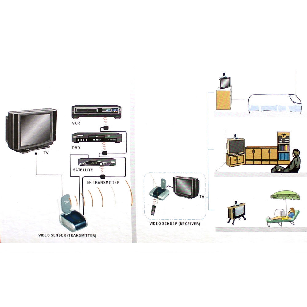 Das Archsat- System überträgt Bild und Ton bis zu 50m weit. Anwenungsbeispiel: Sie möchten Ihren im Wohnzimmer aufgestellten Receiver auch vom Hobby-Raum aus steuern und Fernseh- sowie Radioprogramme am dort betriebenen TV-Gerät sehen und hören. (Abbildung ähnlich).